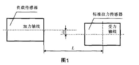 鋼絲繩鏈接校準方法是采用單根鋼絲繩用連接頭串聯標準傳感器和臥式拉力試驗機負載傳感器進行力值校準的方法這種校準方法等同于模擬產品檢測,是校準示值直接有效的一種方法。但是,標準拉力傳感器、鋼絲繩、試驗機的接頭部位在鏈接時存在間隙引起拉力或壓力傳感器位置的偏移,位置的偏移產生加力軸線與受力軸線的同軸度誤差,如圖1所示。同軸度誤差引起的示值誤差計算如下: