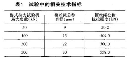 例如:校準100kN臥式試驗 機,選用6×9W+FC纖維芯鋼絲繩,d:13mm,鋼絲繩公稱抗拉強度為1870MPa,K":0•332,最小破斷拉力為 104•0kN。各種規格臥式拉力試驗機選用不同直徑的 6×9W+FC纖維芯鋼絲繩的公稱抗拉強度,如表1所示。